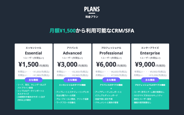 「pipedrive」は、初期費用0円、年間払いの場合、月額1,500〜6,000円/1ユーザーで利用できます。14日間のフリートライアル期間を設けており、使いやすさを確認してから導入