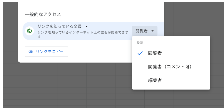 プルダウンに「リンクを知っている人全員」が現れるので選び、閲覧者(閲覧するだけ)、閲覧者(閲覧およびコメントできる)、編集者(編集もできる)から役割を選び、指定します。