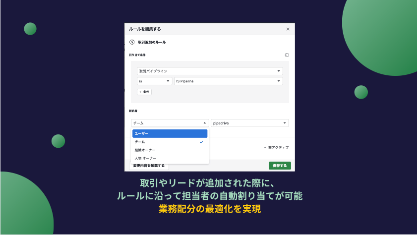 追加された取引やリードを、定められたルールに基づいて自動的に担当者に割り当てることが可能です。これにより、取引やリードの管理が最適化され、担当者の配分に手間をかけることなく効率的なビジネス運営を可能にします。