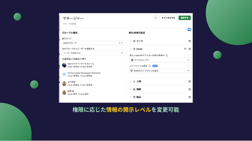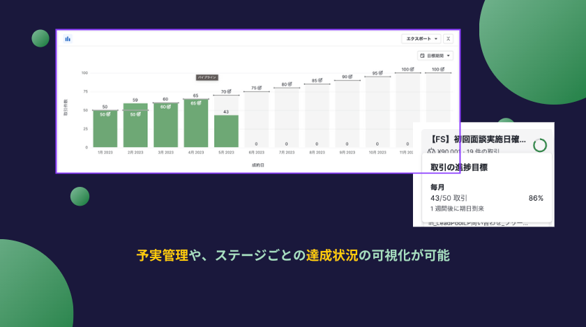 プロフェッショナルプランでは、複数のチームを作成し、それぞれに対する案件管理や目標管理を効率化することが可能です。さらに、権限に応じて情報の開示レベルを調整でき、進捗状況の可視化を実現します。これにより、チーム全体の生産性と協調性が高まります。
