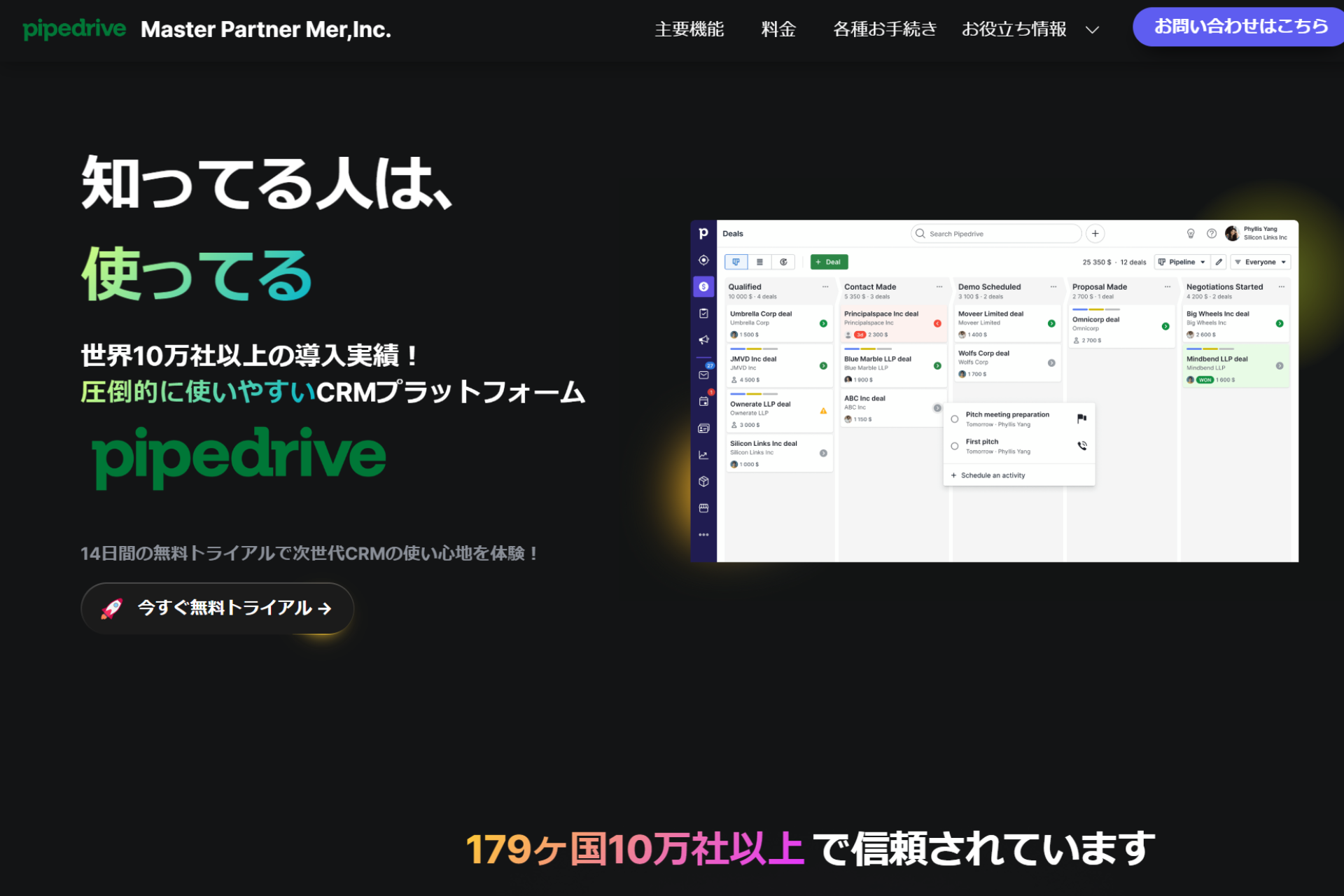 Pipedriveとは世界で10万社以上も導入実績のある営業支援ツールです。営業プロセスを可視化し、進捗状況や成果の管理がしやすい仕様であるため、期限を過ぎているタスクや過去の顧客とのコミュニケーション履歴などの情報をツール内で蓄積・分析が可能です。