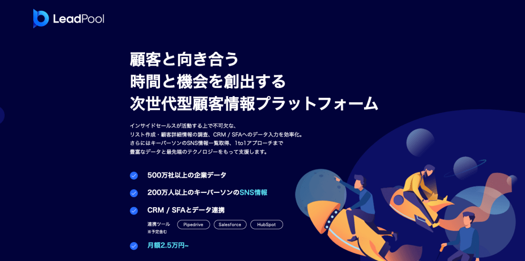 Merが提供するLeadPoolは、顧客と向き合う次世代型顧客情報プラットフォームです。顧客リスト作成、顧客の詳細情報の調査、顧客管理ツール(CRM)や営業支援ツール(SFA)へのデータ入力など、インサイドセールスが活動する上で必須の業務の効率化を実行します。